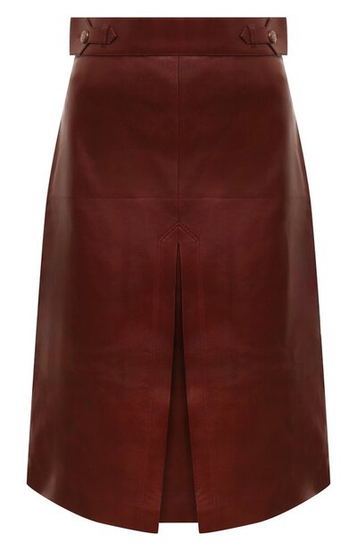Юбку с разрезом, застегивающуюся потайной молнией сзади, выполнили из гладкой блестящей кожи ягненка. Модель с подкладом из вискозы дополнили на широком поясе фигурными патами с эмалированными пуговицами, декорированными монограммой GG.
