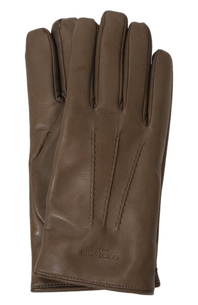 Перчатки выполнили из мелкозернистой кожи и утеплили кашемировой подкладкой. Тыльную сторону украсили фактурными швами, а запястье — тисненым логотипом бренда. На манжете предусмотрели короткий разрез.