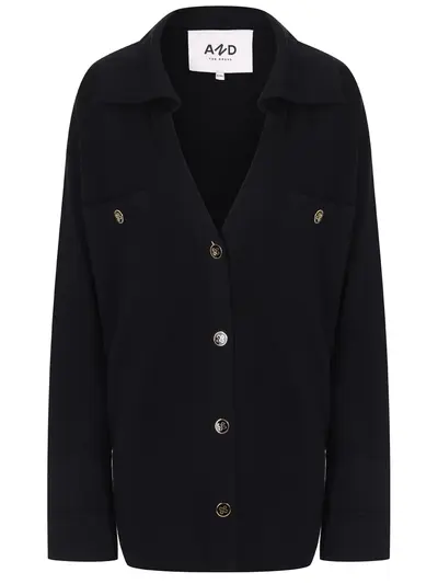 -Черная трикотажная рубашка из смесовой шерсти от AND THE BRAND. -Модель свободного силуэта со спущенной линией плеча, длинными рукавами, широкими манжетами, отложным воротником, крупными накладными карманами, застежкой на пуговицы.