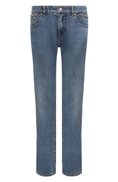 Пояс базовых джинсов акцентируют боковые цепочки, как у фирменной сумки Falabella. Сзади – узкий брендированный патч и вышитая на кармане эмблема. Модель чуть зауженного кроя выполнили из органического хлопка с сертификатом GOTS.
