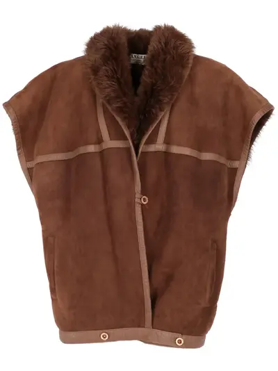 circa 1980s chocolate brown sheepskin suede front button fastening shearling collar leather trim sleeveless two side welt pockets shearling lining straight hem Condition: GOOD. This previously owned and used item is in good condition with minimal signs of use. This may include fading of material or plating and scratches.