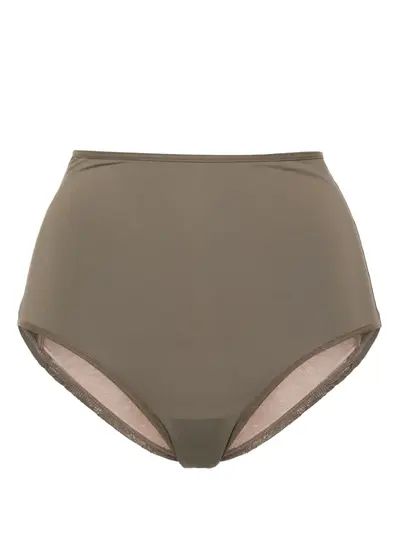 coffee brown recycled nylon blend textured finish brief design high-waisted lace detailing partial lining elasticated waistband Just a reminder that this piece must be tried on over your own garments.