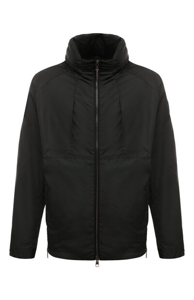 Куртку с двумя карманами и молниями в боковых швах выполнили из нейлона, который хорошо защищает от ветра. Объемный капюшон можно убрать в отсек на воротнике-стойке. Сзади изделие украсили небольшим логотипом марки.