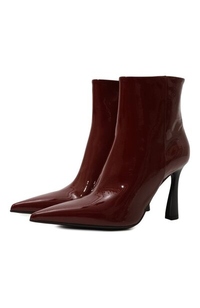 Для создания ботильонов с удлиненным зауженным мысом использовали гладкую лакированную кожу с глянцевым блеском. Модель на высоком фигурном каблуке застегивается боковой молнией.