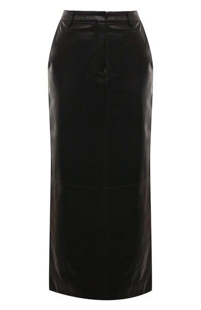 Макси-юбку с боковыми и задними прорезными карманами сшили из наппы двойного дубления, отполированной до блеска. Чтобы в прямой модели со шлевками на поясе было удобно двигаться, сзади предусмотрели высокую шлицу. Изделие застегивается скрытой короткой молнией спереди.