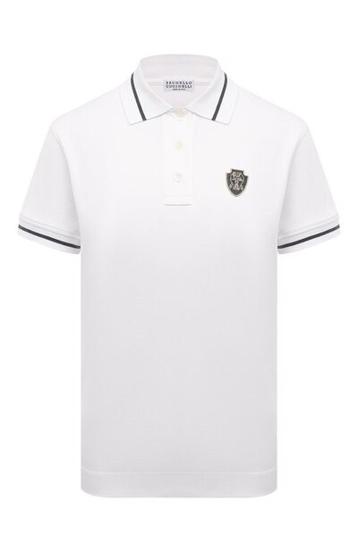 Для пошива поло использовали хлопковый интерлок. Манжеты и отложной воротник подчеркнули узким контрастным кантом. Модель украшена спереди патчем с геральдическим символом марки.