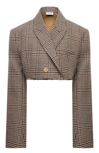 Для пошива укороченного двубортного жакета с необработанным низом использовали фактурный шерстяной твид в клетку «принц Уэльский». Приталенную модель с акцентированной линией плеч и одним карманом предлагаем носить с парной миди-юбкой и контрастными водолазкой и туфлями.