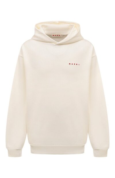 Худи со спущенной линией плеч сшили из органического хлопка. Модель украсили логотипом спереди, который увеличили и повторили на спинке, словно смяв его.