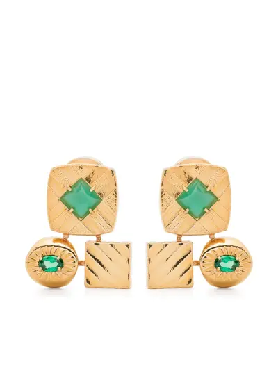 gold-tone gold-plated silver polished finish drop design debossed detailing chrysoprase and crystal embellishment clip-on design These earrings come as a pair.