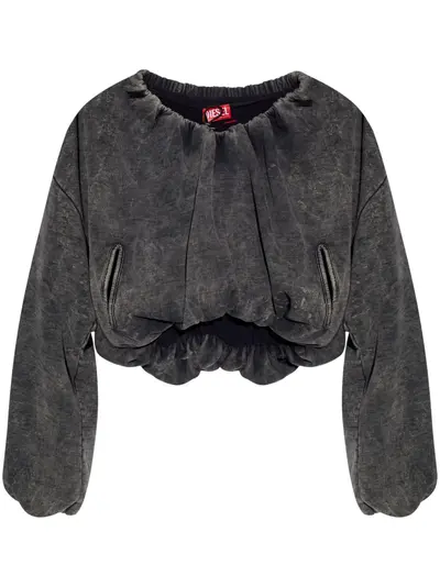 medium grey cotton distressed effect boat neck two side slit pockets balloon sleeves ruched bodice