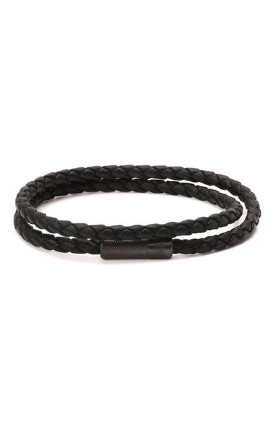 Узкий черный браслет, дважды обвивающий запястье, выполнили из мягкой итальянской кожи, создав на поверхности аксессуара плетеный геометрический узор. Модель застегивается цилиндрическим замком из стерлингового серебра 925 пробы с темным родиевым покрытием.
