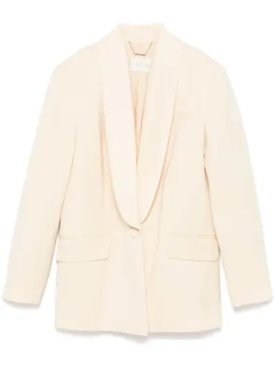 butter yellow wool blend front button fastening shawl lapels shoulder pads long sleeves faux buttoned cuffs two side flap pockets American rear vent logo-jacquard lining