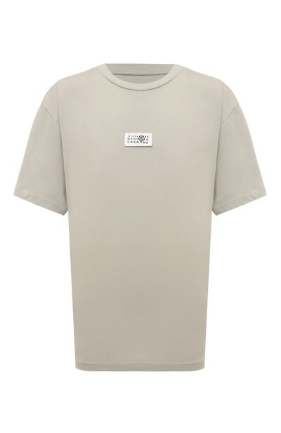 Футболку свободного кроя выполнили из хлопкового джерси. Модель с круглой горловиной и спущенной линией плеч дополнили спереди фирменным патчем с числовым узором. На спинке — тонкая белая строчка.