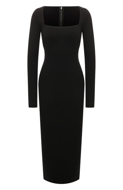 Для изготовления облегающего миди-платья с квадратным вырезом использовали вискозный трикотаж, усиленный нейлоном. Модель со шлицей и молнией сзади декорировали эмблемой DG на одном длинном рукаве.