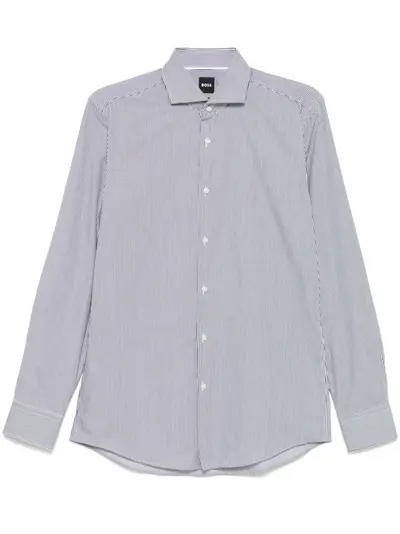 black/white cotton blend poplin texture vertical stripe pattern front button fastening spread collar long sleeves buttoned cuffs dart detailing to the rear curved hem