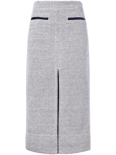 grey/white twill weave faux-leather trim concealed side zip fastening front slit high-rise mid-length straight hem