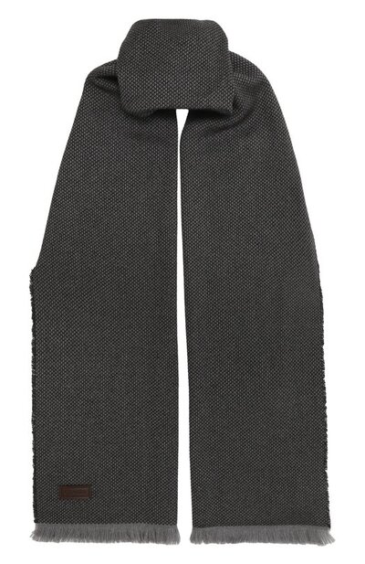 Шарф с меланжевым микроузором будет уместен в образах и с пуховиком, и со строгими пальто. Аксессуар выполнили из плотного трикотажа, связанного из кашемира и шерсти virgin. Изделие украсили бахромой по краям и брендированным кожаным патчем.