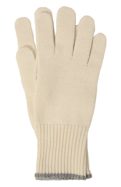Лаконичные перчатки связали из нежной кашемировой пряжи. Единственным декором аксессуара сделали узкий кант на широкой эластичной манжете в рубчик.