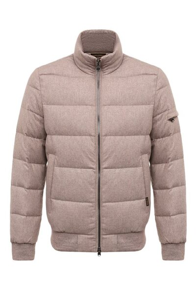 Бомбер с горизонтальным стеганым узором и трикотажными манжетами и низом сшили из габардина на основе кашемира и нейлона. Куртку, утепленную переработанными утиными пухом и пером, дополнили воротником-стойкой, тремя внешними и одним внутренним карманами.