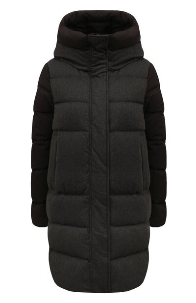 Стеганый пуховик сшили из микса кашемирового габардина и нейлона. Модель со штормовой планкой, прикрывающей молнию, утеплили переработанными пухом и пером. Куртку дополнили двумя прорезными карманами и объемным капюшоном, украшенным фирменной эмблемой.
