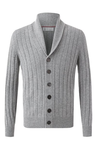 Меланжевый кардиган с рифленым узором связали из кашемировой пряжи в два сложения. Модель с шалевым воротником будет уместно смотреться и в комплекте для офиса с нестрогим дресс-кодом, и в повседневном образе.