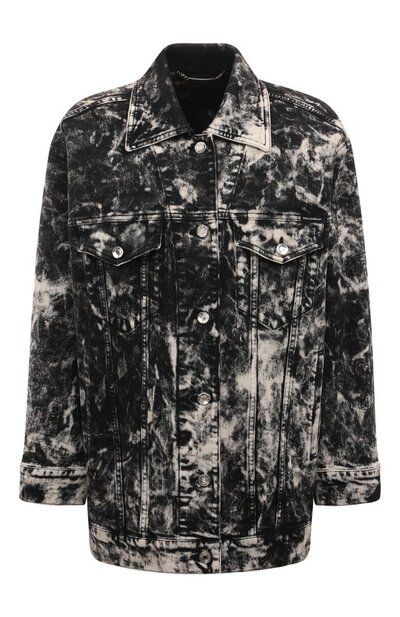 Джинсовую куртку из плотного хлопка, укрепленного эластичными нитями, окрасили в готовом виде, создав мраморный эффект. Модель с четырьмя карманами и патами на поясе по бокам украсили фирменной двухслойной пластиной под отложным воротником сзади.