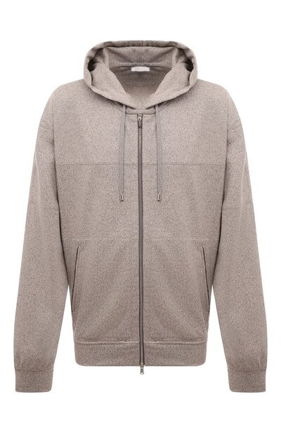 Толстовку с регулируемым капюшоном выполнили из шерсти с добавлением кашемира. Меланжевое изделие дополнили парой прорезных карманов на молниях. Предлагаем сочетать модель с белой футболкой, парными брюками и светлыми кедами.