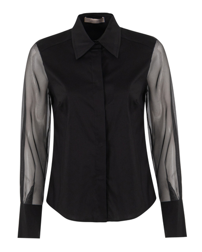Полупрозрачная шелковая блуза на пуговицах и откидным воротом прекрасно подойдёт для стильного образа. Воздушные рукава в сочетании сделают образ легким и нежным