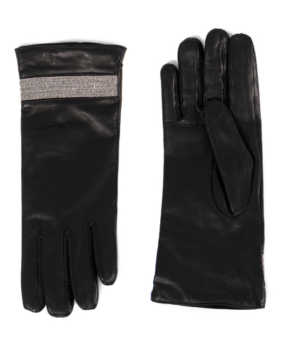 Черные кожаные перчатки со стразами создадут стильный акцент в повседневном образе женщины. Высококачественная мелкозернистая кожа не трескается, не теряет блеска и не истирается.