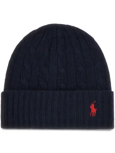 navy blue wool-cashmere blend cable knit round crown ribbed turn-up brim signature Polo Pony embroidered