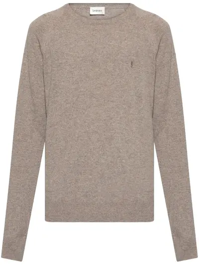 light brown cashmere knitted construction mélange effect crew neck signature Cassandre logo embroidery long raglan sleeves ribbed cuffs and hem