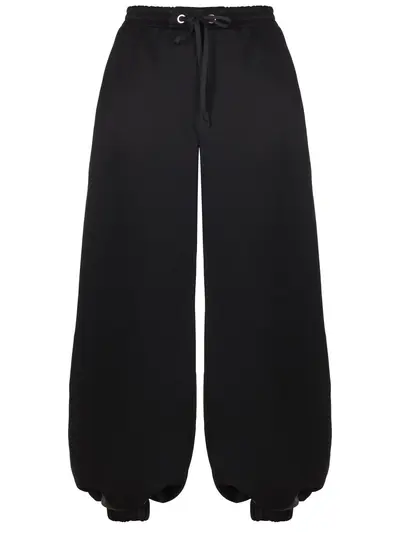 -Черные брюки из вискозного атласа от LES ARCHIVES. -Модель объемного кроя с эластичным поясом на кулиске для выбора комфортной высоты посадки, манжетами в нижней части брючин, прорезными карманами.