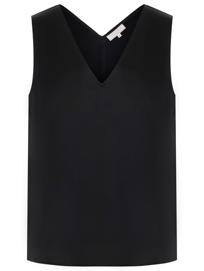 -Черный топ из атласа с деликатным блеском от ANTONELLI. -Модель свободного кроя с V-образными вырезами на груди и спине дополнит повседневные и коктейльные образы с широкими брюками и жакетом.