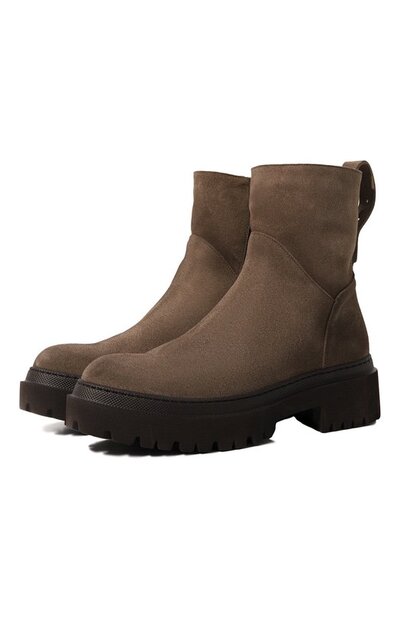 Полусапоги с регулируемой петлей на заднике сшили из замши, дополнив подкладкой из овчины. Массивная подошва с каблуком и протектором защищает от небольших луж. Пара застегивается боковой молнией.