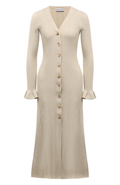 Приталенное миди-платье с чуть расклешенным подолом выполнили из тонкого рифленого трикотажа на основе вискозы с добавлением металлизированных нитей. Модель с V-образным вырезом и оборками на манжетах застегивается спереди золотистыми пуговицами разных форм.