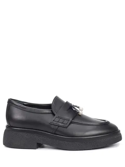 -Модель с округлым мысом, форму которого подчеркивает объемный декоративный шов, толстой подошвой и низким каблуком, поперечным ремешком с прорезью на подъеме, декором металлофурнитурой с жемчужинами, внутренней отделкой из натуральной кожи.