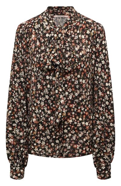 Блузу с цветочным паттерном сшили из вискозы с добавлением эластана. Модель с воротником аскот и длинными объемными рукавами станет идеальным компаньоном для однотонных вещей.