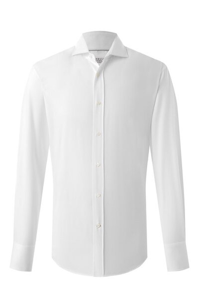 Прямую рубашку с воротником «?акула»? выполнили из мелкофактурной ткани, в которой соединили хлопок и лайкру. Модель застегивается перламутровыми пуговицами.