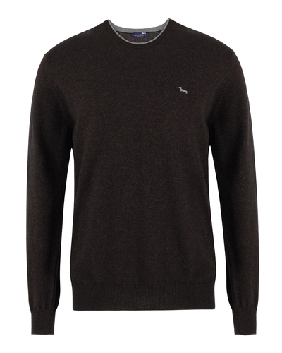Этот мужской пуловер с круглым вырезом из смеси кашемира - идеальный универсальный вариант для ношения в течение всего дня, как в офисе, так и в свободное время. Чистый, изысканный дизайн модели, однако, не лишен нотки щегольства и даже демонстрирует тонкую контрастную полоску по краю горловины и манжетам. Этот универсальный и удобный пуловер обычного кроя дополнен горловиной, манжетами и подолом в рубчик, а на груди вышит культовый символ Harmont & Blaine - такса.