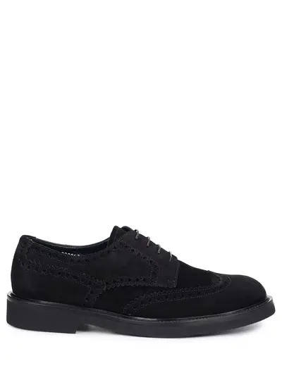 -Модель с округлым мысом, функциональной шнуровкой, резиновой подошвой и низким каблуком, брогированием деталей, внутренней отделкой из тёплой байки.