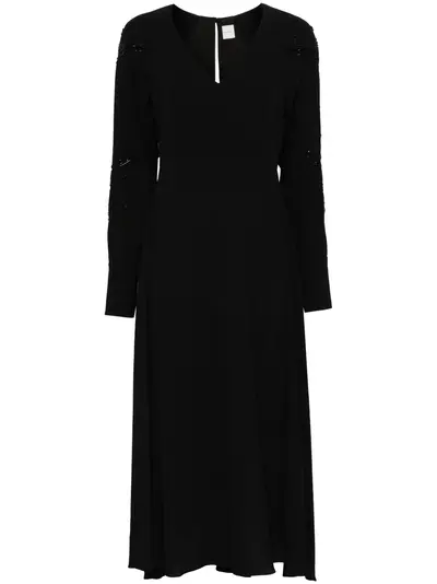 black crepe texture bead embellishment rear button fastening V-neck long sleeves buttoned cuffs keyhole detail to the rear partial lining flared