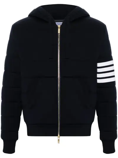 navy blue virgin wool jersey texture signature 4-Bar stripe signature grosgrain loop tab ribbed trim padded design drawstring hood front two-way zip fastening long sleeves two side welt pockets straight hem