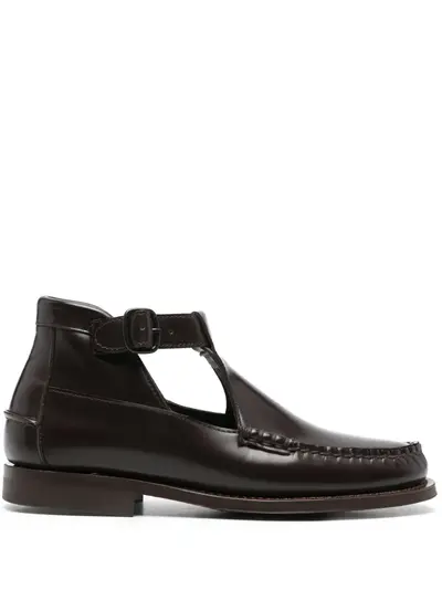 cedar brown calf leather brushed effect buckle-fastening ankle strap stacked heel ankle-length T-bar strap round toe branded leather insole leather outsole