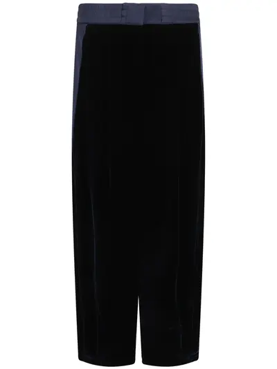 midnight blue velvet hook and zip fly fastening elasticated waistband contrasting panel detail two side slash pockets unlined elasticated hem wide leg