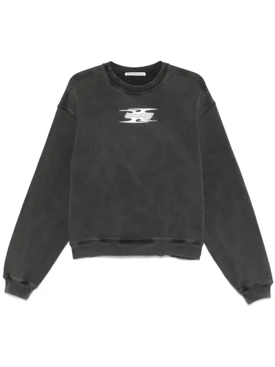anthracite grey cotton jersey texture faded effect blade appliqué logo crew neck drop shoulder long sleeves ribbed cuffs and hem French terry lining straight hem