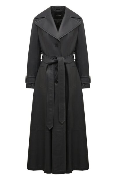 Для пошива тренча с боковыми карманами использовали гладкую кожу. Низ плаща сделали расклешенным, а воротник и лацканы увеличили. Модель с поясом-лентой и съемными патами на рукавах дополнили подкладом из тонкого текстиля.