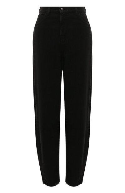 Джинсы с пятью карманами сделали свободными на бедрах и слегка зауженными книзу. Для пошива лаконичной модели с высокой посадкой использовали неэластичный твил из смеси вискозы и хлопка.