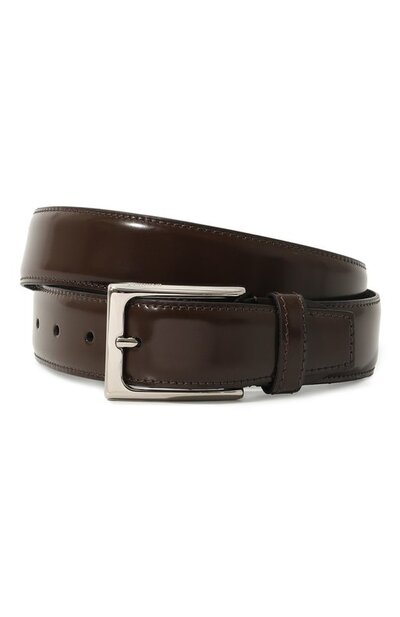 Лаконичный ремень средней ширины изготовлен из гладкой кожи, отполированной до легкого блеска. Аксессуар с одной шлевкой и зауженным краем дополнен прямоугольной металлической пряжкой.