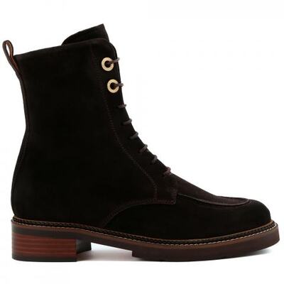Коричневые ботинки Pertini – универсальный вариант для повседневных образов. Модель выполнена из замши, на резиновой подошве и невысоком каблуке. Внутри шерстяной подклад и стелька из натурального меха. Пара застегивается на молнию, при этом шнуровкой можно регулировать посадку. Завершают лаконичный дизайн крупные люверсы на шнуровке. Ботинки можно сочетать как с брюками, так и с юбками.