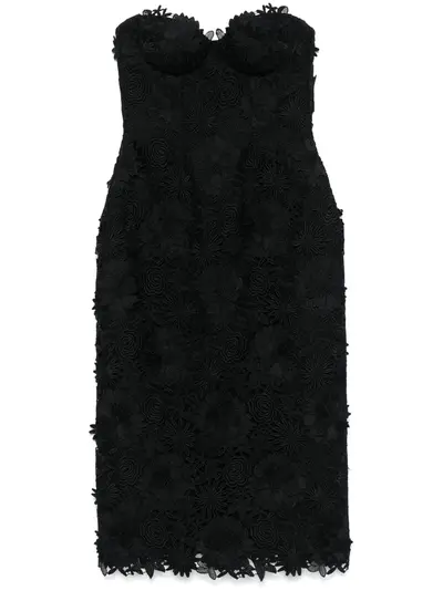 black macramé detailing 3D floral detailing concealed rear zip fastening boned bodice bustier-style neckline strapless fitted waistline full lining straight hem mid-length